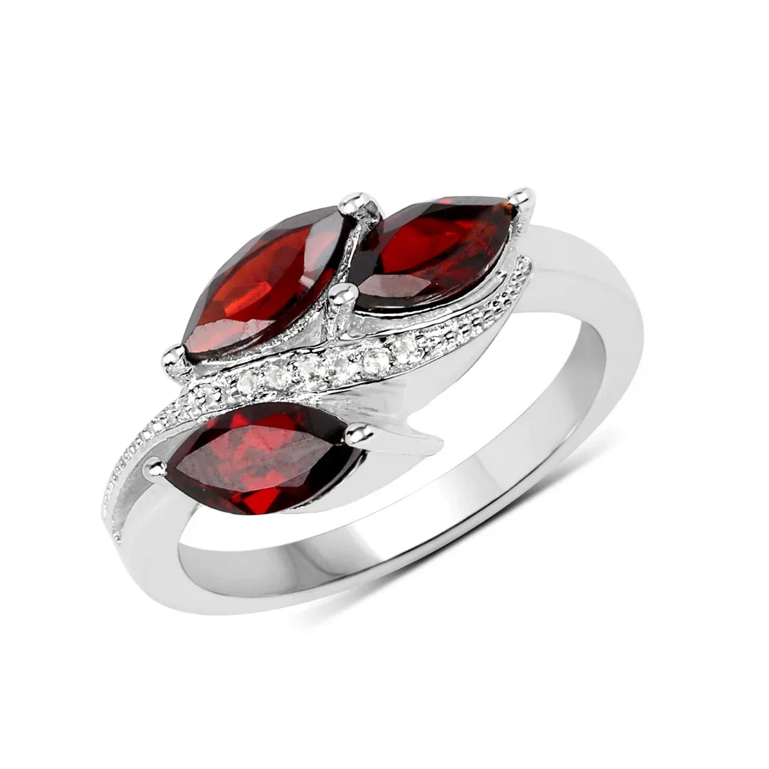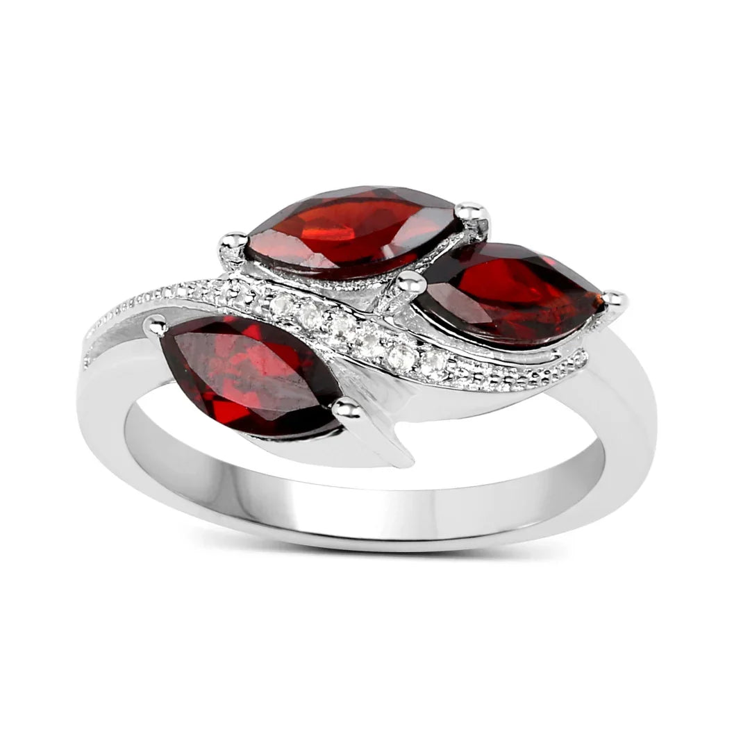 Anillo de plata de ley de 3 piedras con granate y topacio blanco