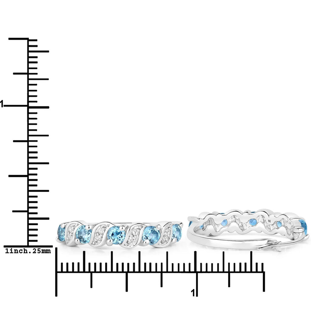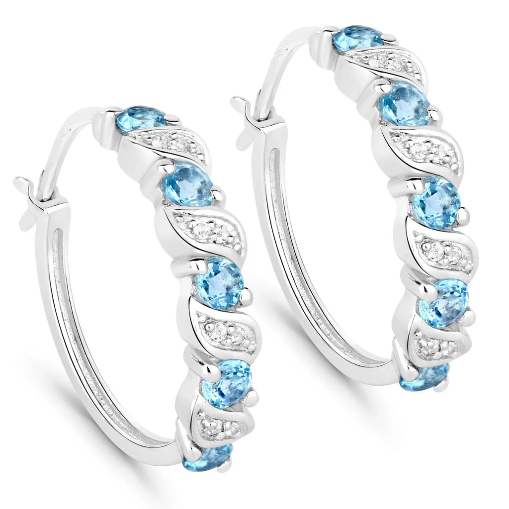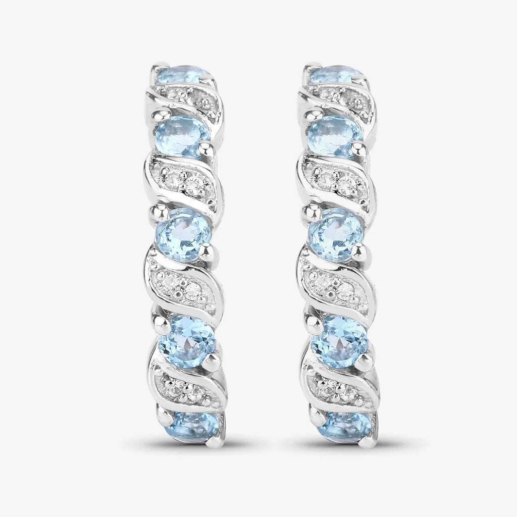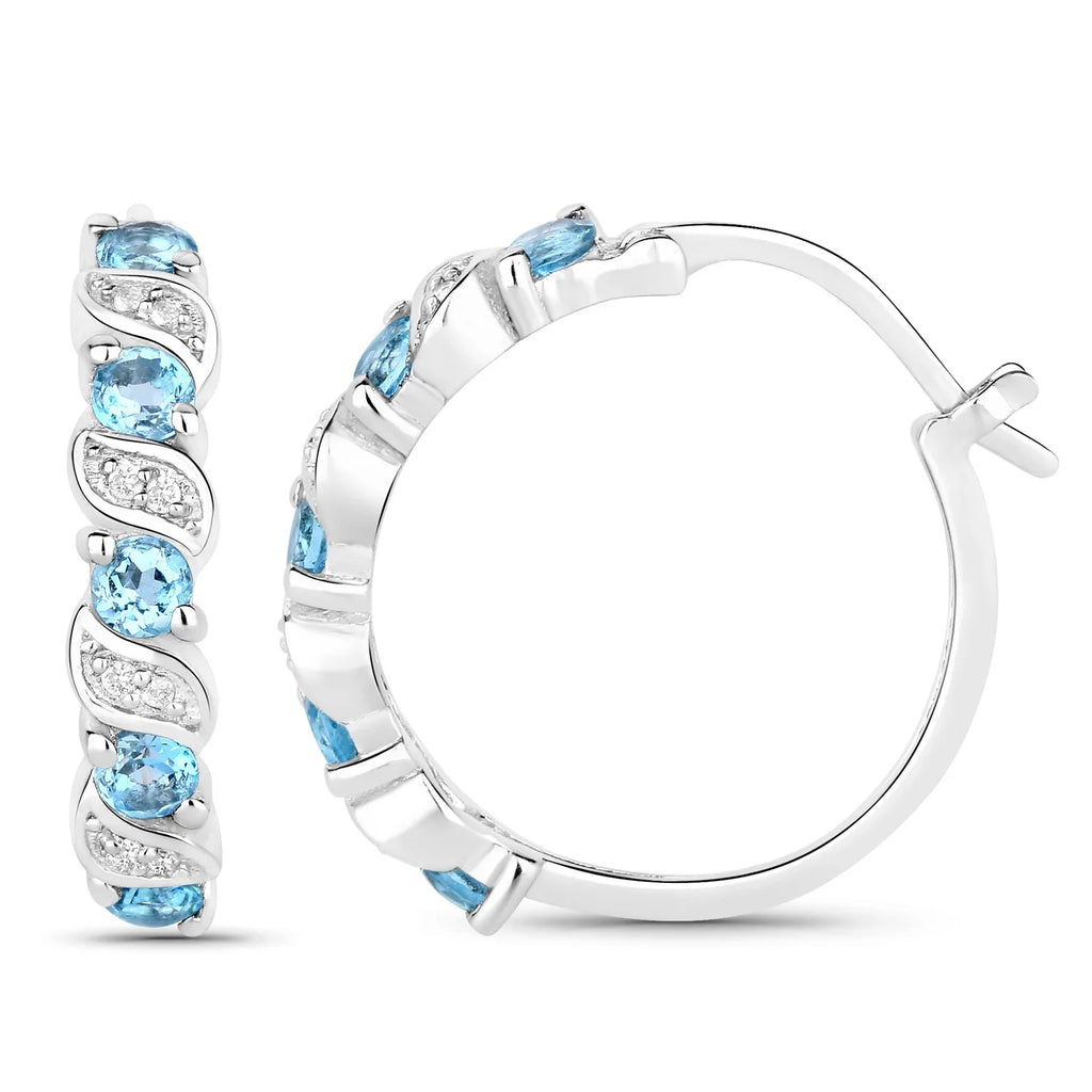 These sterling silver hoop earrings for women feature a polished rhodium-plated finish paired with the vivid sparkle of Swiss blue topaz and white topaz stones. With a total weight of 4.20 grams, these gemstone hoops are designed for comfort and daily wear. The earrings hold 10 round-cut Swiss blue topaz stones totaling 1.20 carats and 16 natural white topaz accents weighing 0.08 carats—altogether delivering 1.28 ctw of brilliance in an elegant open hoop design.