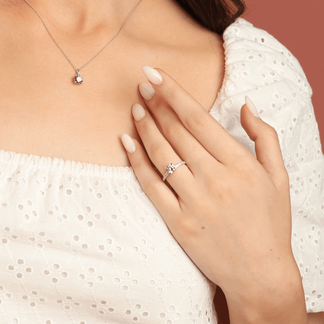 At its heart, the ring features a resplendent 6.5 mm Pink Sapphire, a gemstone associated with royalty, wisdom, and timeless beauty. Known for its enchanting pink hues, it is believed to bestow luck, wisdom, and unwavering loyalty. Moreover, the ring's design is rich in symbolism, with each leaf representing hope, faith, love, and luck. This not only adds depth but also an element of sophistication and elegance to any ensemble.