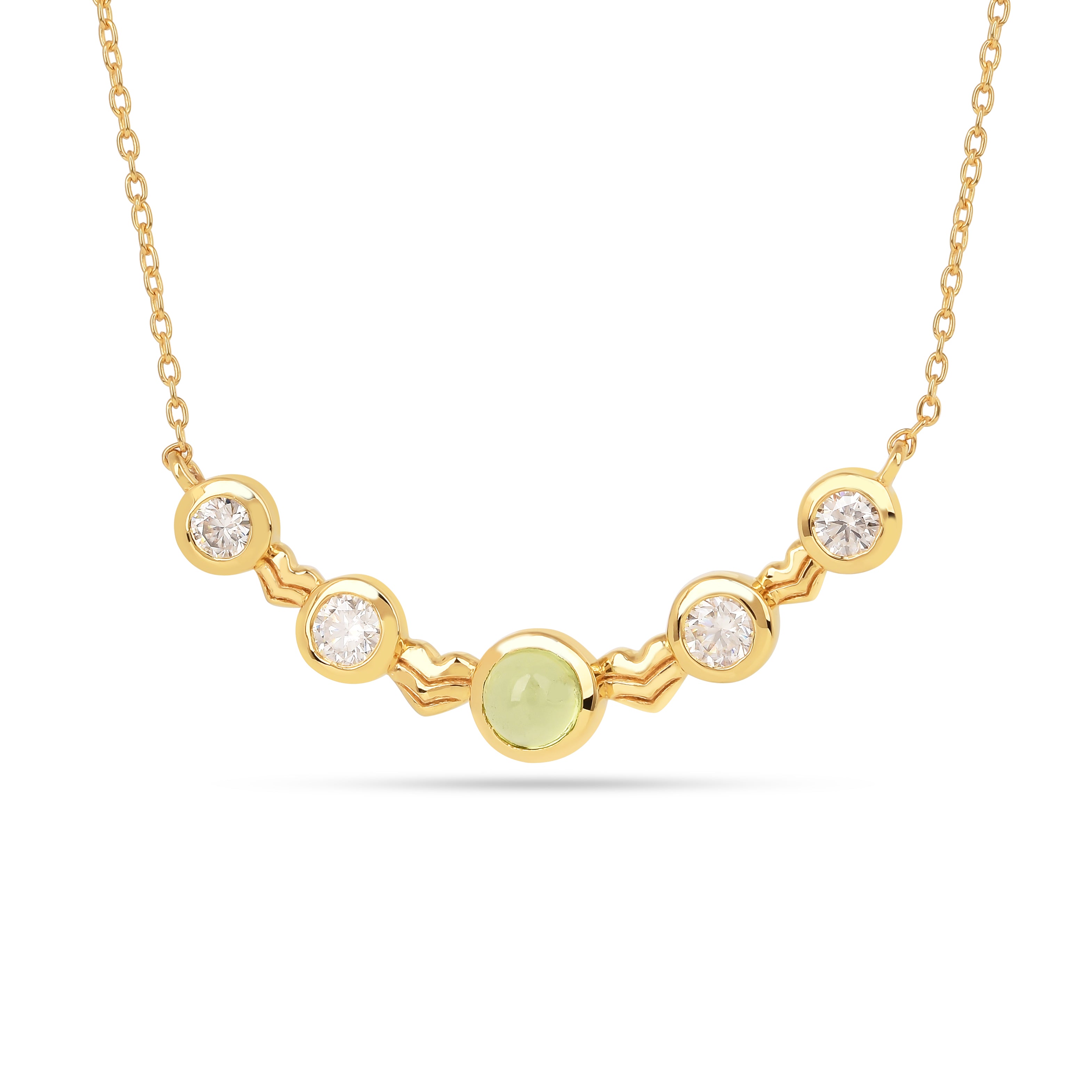 Elevate your everyday style with this Five-Stone Peridot Necklace, a perfect blend of minimalism and elegance. Crafted from 925 sterling silver and plated with 18K yellow gold, this modern gemstone necklace features a gracefully curved row of five bezel-set gemstones, designed for effortless sophistication.