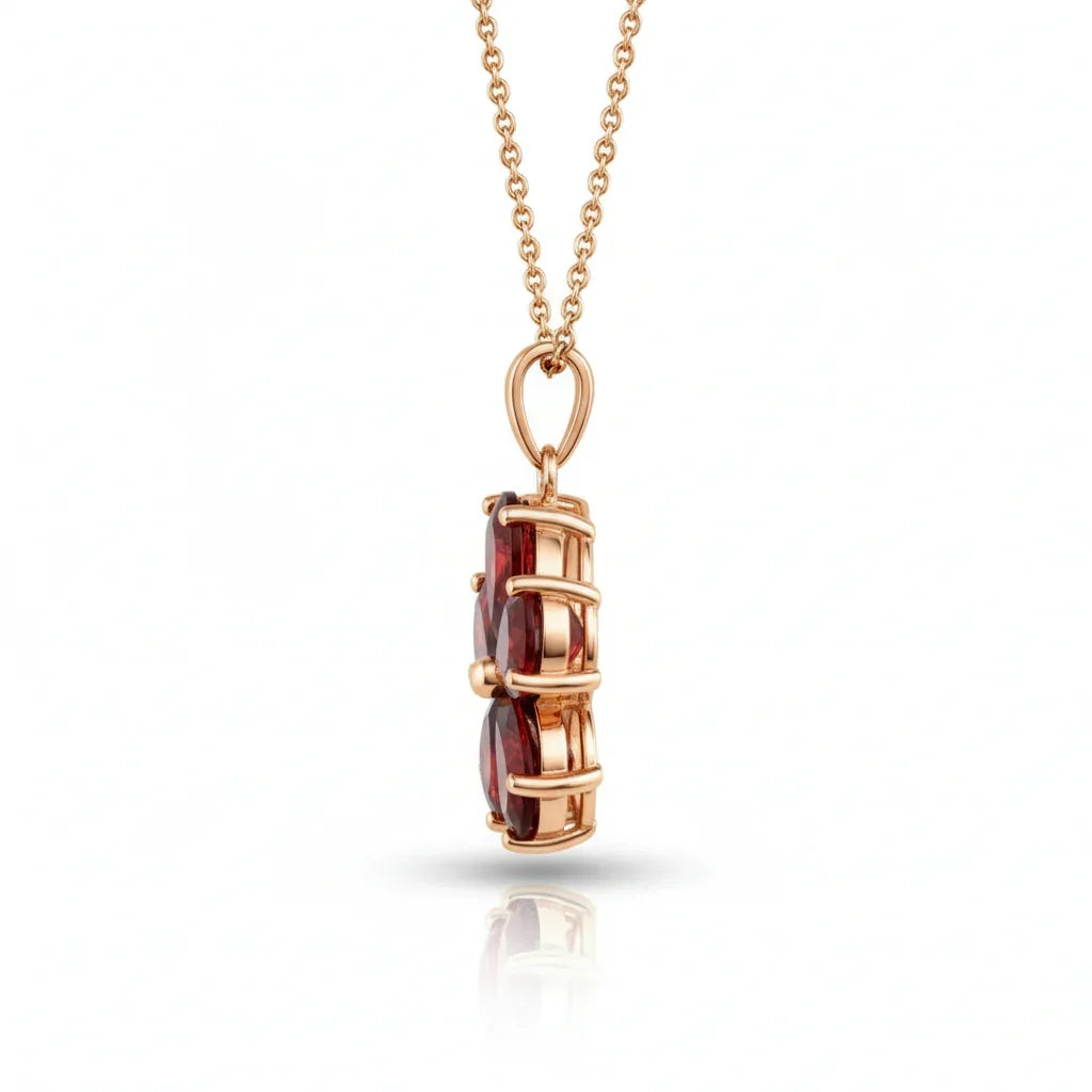 This floral pendant necklace silver features a natural pear-shaped garnet in a graceful flower design. Crafted from 925 sterling silver, the pendant holds five 7×5 mm pear-cut garnets with a combined stone weight of 4 ct. The pink/rose gold 0.5 micronplating enhances the vibrant red hues, giving the garnet flower necklace an elegant finish.