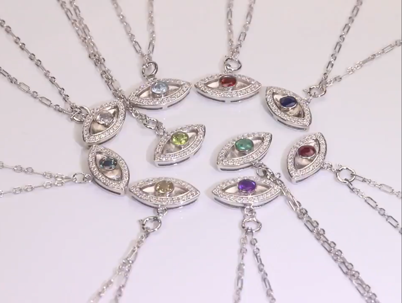 This Evil Eye Necklace will bring good fortune and protection. The center of the eye features a shiny Garnet stone surrounded by shimmering Moissanite to complete this standout design.