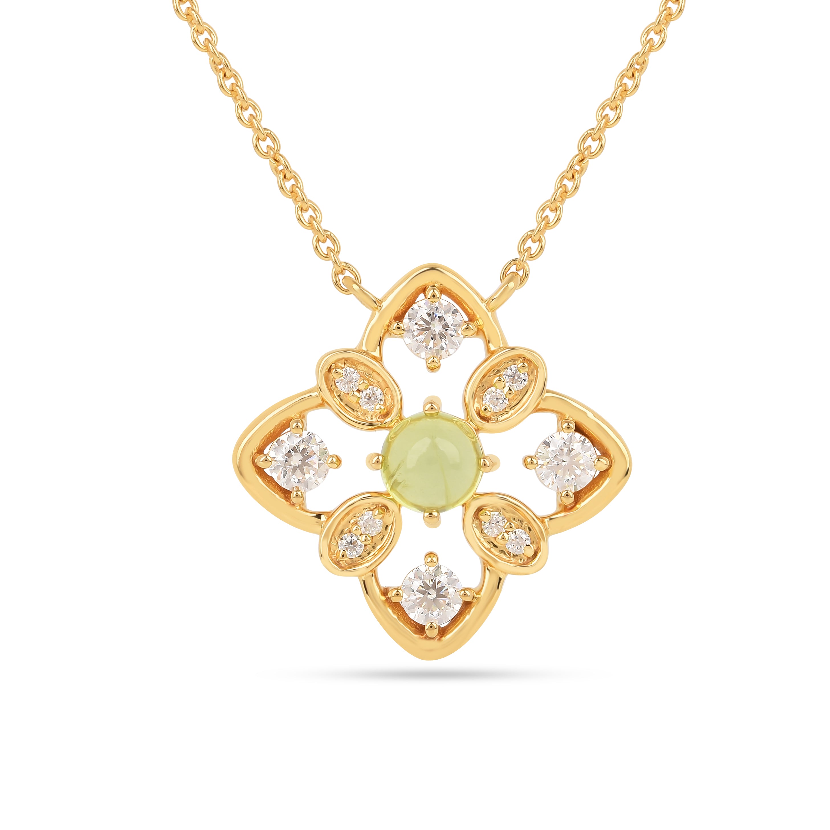 Enhance your jewelry collection with this Sterling Silver Peridot Quatrefoil Pendant Necklace, a perfect blend of elegance and symbolism. Crafted from high-quality 925 sterling silver and finished with 18K yellow gold plating, this floral-inspired pendant necklace features a vibrant 5mm round peridot ( 0.32 ct) at its center. Known for its bright olive-green hue, the natural peridot gemstone is surrounded by a delicate quatrefoil floral design, adding a nature-inspired charm to this lightweight sterling silver floral pendant. Weighing just 3.80 grams, it hangs gracefully from an adjustable 16+2-inch cable chain, secured with a fish lock closure for convenience and durability.